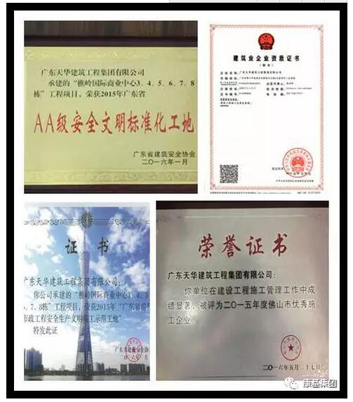 二、天華建筑再上臺階,閃亮榮譽接(jie)踵而來。成功(gong)晉升房建總承包壹級(ji)資質,行業(ye)誠信獲評A級(ji),被評為“2015年度(du)佛(fo)山市優(you)秀施工企(qi)業(ye)”、“2015年度(du)南海區建筑業(ye)優(you)秀企(qi)業(ye)”。承建樵嶺國際商業(ye)中心(xin)3-8棟工程項目獲評廣東省標桿工程項目。